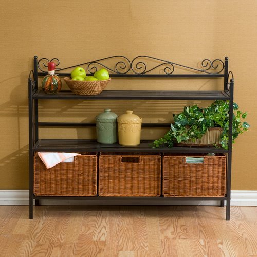 Simple and stylish, this baker's rack solves the storage issues of the kitchen. Take advantage of the spacious four wicker drawers to store your dish towels, pots and pans, cookbooks, and more. The shelves are perfect for showing off fancy plates and cups.